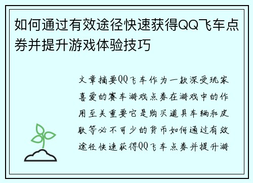 文章摘要:QQ飞车作为一款深受玩家喜爱的赛车游戏,点券在游戏中的作用至关重要,它是购买道具、车辆和皮肤等必不可少的货币。如何通过有效途径快速获得QQ飞车点券并提升游戏体验,成为了广大玩家关注的重点。本文将从四个方面进行详细阐述,首先介绍通过游戏内活动、任务等途径积累点券的策略;其次探讨通过充值活动和...